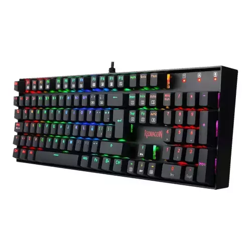 Teclado Mitra K551RGB: Es un teclado mecánico robusto y fiable, diseñado para resistir un uso intenso. Cuenta con una placa de acero de refuerzo, teclas de doble inyección y un diseño anti-salpicaduras. Utiliza switches Redragon Blue, que ofrecen una respuesta táctil con un clic audible, ideal para quienes buscan una retroalimentación sonora y sensible. Además, su retroiluminación RGB Chroma es completamente configurable, permitiendo una personalización total.