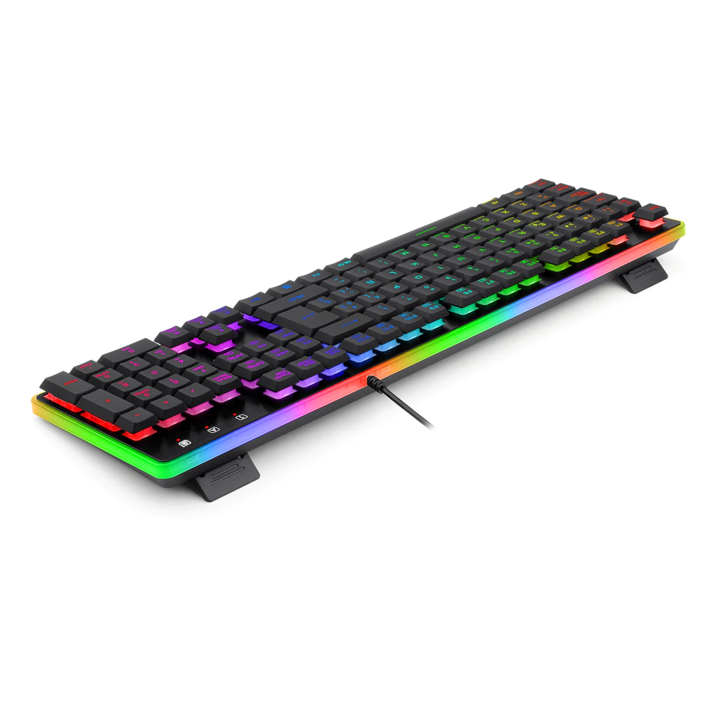 El Redragon Dyaus 2 K509 RGB es un teclado de membrana silencioso, ideal tanto para gaming como para escritura. Su construcción es robusta, con una combinación de aluminio, plástico ABS y teclas de doble inyección, lo que garantiza una gran durabilidad. Cuenta con una atractiva retroiluminación RGB de 7 colores que permite configurar la intensidad del brillo y la velocidad de los efectos de respiración.