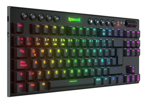 Este teclado utiliza switches Redragon Red de perfil bajo, que son lineales y silenciosos, ideales para quienes buscan una respuesta rápida sin el sonido de clic. Su construcción robusta incluye una placa de aluminio anodizado y plástico ABS reforzado, que lo hace duradero y resistente a salpicaduras. Cuenta con 100% anti-ghosting y full N-key rollover para asegurar que cada pulsación se registre correctamente.